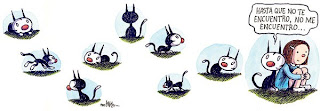 A mi gato Rafael, como ya conte antes, se le ha dado por irse de expedicion nocturna. Cosa que me pone de los pelos, al principio rompio un vidrio intentando escaparse por la ventana y como me olvido de todo, nunca mande a hacer el vidrio nuevo y he intentado de todo para que no escape pero igual lo seguia haciendo asi que decidi darle mi consentimiento y dejarle la puerta abierta apenas con una traba de esas de cadena. Tampoco es cuestion que por dejar salir al gatito aparezcamos en las primeras planas de la prensa amarillista. Asi que el muchacho puede entrar y salir a piacere. De todas formas y se que esto hablara muy mal de mi cuando sea madre, no me puedo dormir si no veo que el gato esta aun dentro de la casa. Entonces hago cosas ridiculas, salgo con mi piyamita a recorrer como un fantasma el edificio a las 3 de la mañana y le hago ruiditos para que me reconozca y venga, y no soy solo yo, Vicente mi otro gato que no es tan aventurero, viene conmigo, maullando de una manera extraña, cada vez que buscamos a Rafy, no dice el clasico "miau", dice "prrrr prrr". Mierda pienso, estoy demente, que me preocupa el gato?!, seguro se sabe cuidar mejor que yo, pero es mas fuerte, no puedo...y me vengo a la computadora y entro a los Blogs de todos unas 165 veces cada vez, solo que casi todos viven en España y eso significa que estan durmiendo, entonces veo videos en el Youtube, y pienso en lo que voy a hacer mañana y el puto gato que no aparece!!!!!. Entonces me gana el cansancio y me voy a la cama, suspirando porque me imagino al gatito en problemas...y ahi empieza la segunda parte, intento dormir, pero no puedo, porque?????. Porque Vicente, el gato no aventurero, es un "buchon" como le decimos aqui, y "me cuenta" que Rafael no esta, JA! como si no lo supiera, claro si, uds pensaran esta loca pobrecita, el trauma del ojo de Buñuel...pero el muy hijo de su madre se me para al lado de la cama y me dice: "Prrrr prrr prrrr" toda la bendita noche!!!!!. Y no me dice :"miau" (cambiame el agua) o "miau" (quiero mas comida) o miau (el baño esta sucio), me dice PRRRR PRRRR que significa: "El otro gato esta afuera! el otro gato no esta!". Claro total, ellos duermen de dia, y mi novio esta ahi que cae como un tronco, como hace?..